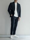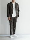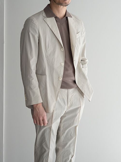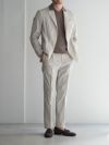 ディテールはノッチドラペル3つボタンの段返り、ポケットはバルカパッチ仕様。サイドベンツで一枚芯の軽快なジャケットに仕上げています。パンツは2タックのウエストはドローコードとベルトループの2WAY仕様です。