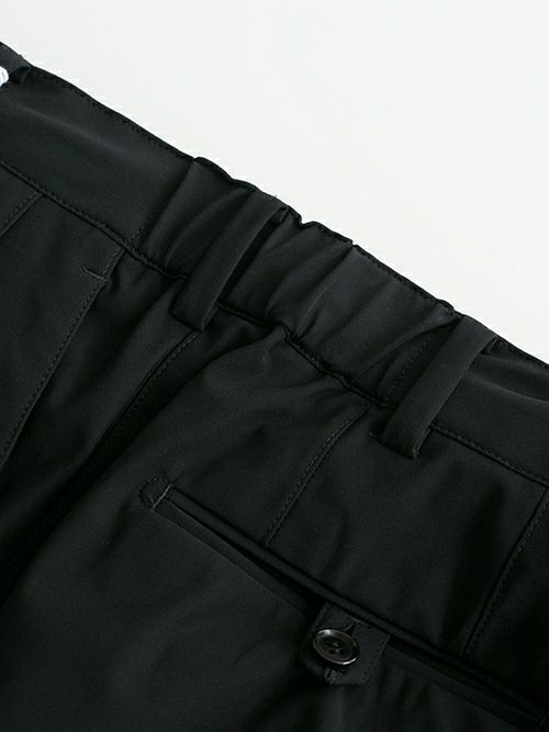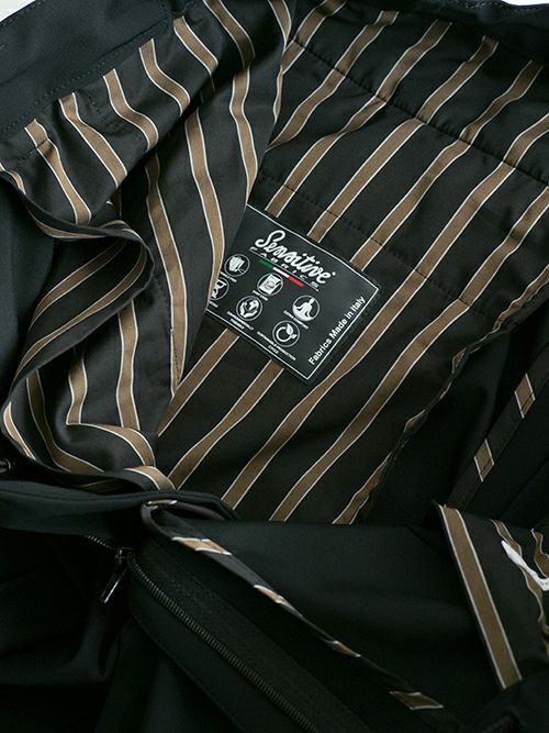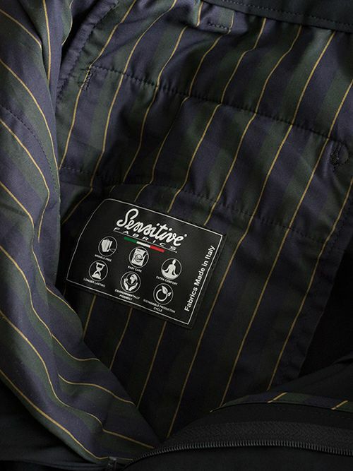 イタリアでは珍しい、ジャージー専業サプライヤーであるEURO JERSEY社の特許取得素材である“SENSITIVE“と名付けられた生地を使用したパンツ。この生地は極細ナイロンとライクラを結束したもの(混率表記はナイロン74%、ポリウレタン26%)で、強い耐久性と物質安定性と回復力にも優れ、また、UVカットで防シワ性と大変機能性に優れた一着です。