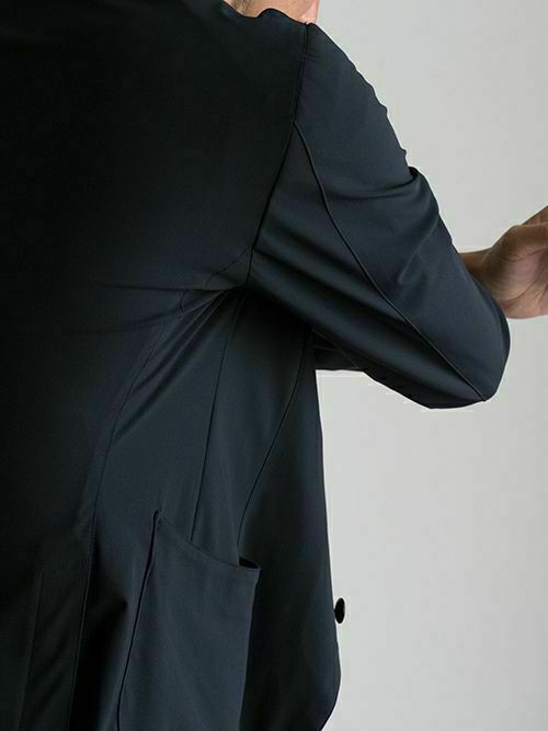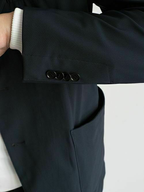 イタリアでは珍しい、ジャージー専業サプライヤーであるEURO JERSEY社の特許取得素材である“SENSITIVE“と名付けられた生地を使用したスーツ。この生地は極細ナイロンとライクラを結束したもの(混率表記はナイロン72%、ポリウレタン28%)で、強い耐久性と物質安定性と回復力にも優れ、また、UVカットで防シワ性と大変機能性に優れた一着です。