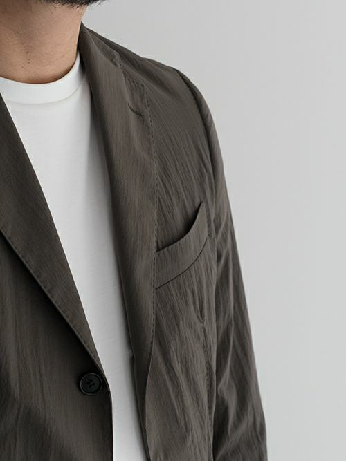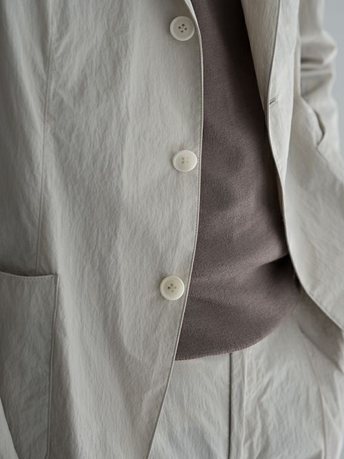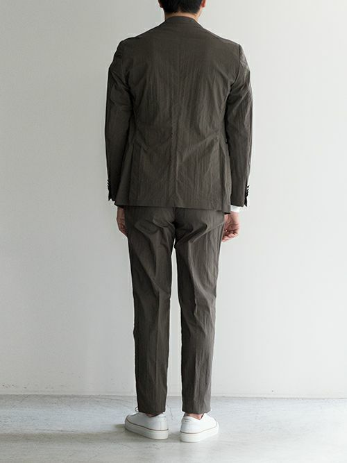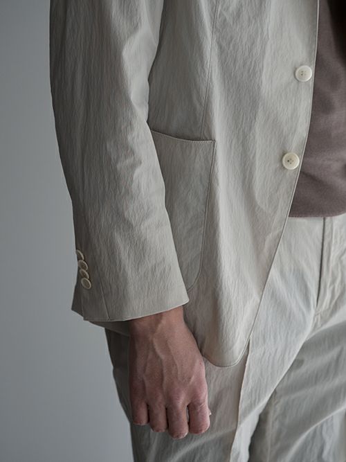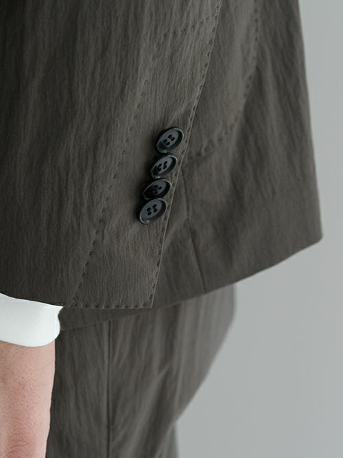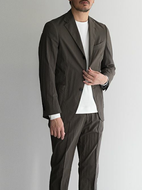 ディテールはノッチドラペル3つボタンの段返り、ポケットはバルカパッチ仕様。サイドベンツで一枚芯の軽快なジャケットに仕上げています。パンツは2タックのウエストはドローコードとベルトループの2WAY仕様です。