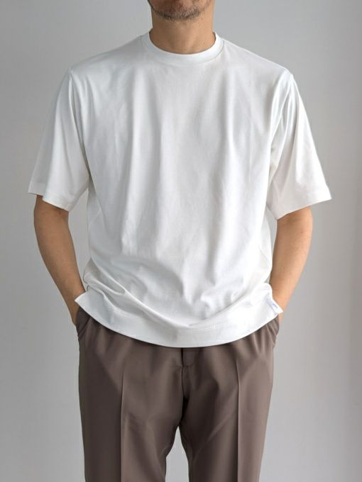 身幅に大きく余裕を持たせたリラックスフィットのカットソー。生地はスビンコットンプラチナム(ファーストピック)のスムース素材を使用しており、肌触りは一般的なコットンとは明らかな違いを感じる事ができます。