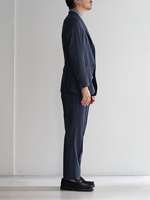 ノッチドラペル3つボタンの段返り、ポケットはバルカパッチ仕様。サイドベンツで一枚芯の軽快なジャケットに仕上げています。パンツは2タックのテーパードシルエット。ウエストはドローコードとベルトループの2WAY仕様。