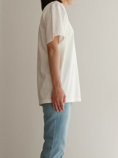 シックなモノトーンカラーに胸元にポップな筆記体のレタードTシャツ。着心地も初めから軽く、ストレスフリーな肌触り。ボリュームのあるパンツやスカートなど、ボトムスを選びません。インナーには勿論のこと、一枚でもサマになるカットソーです。