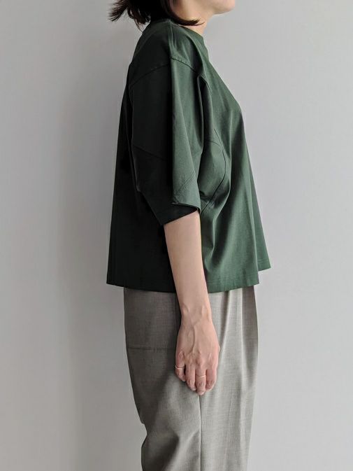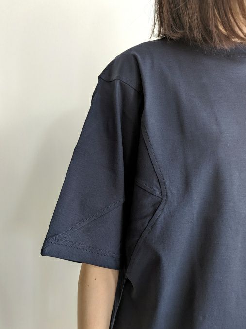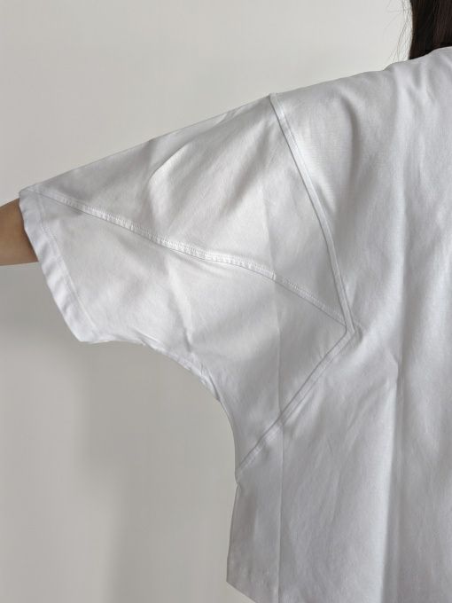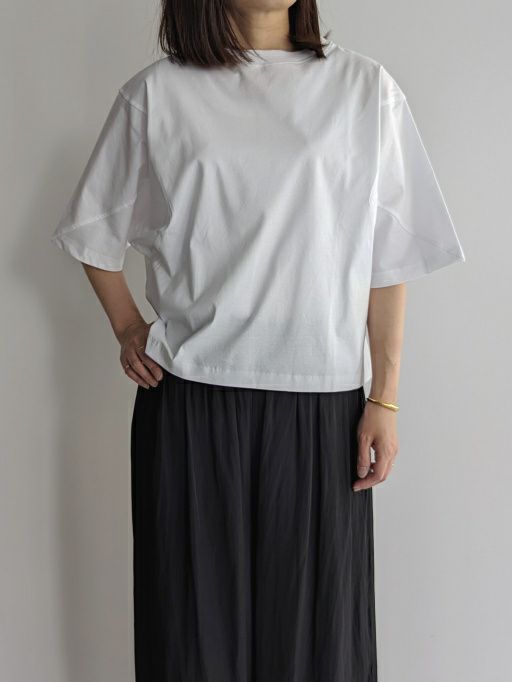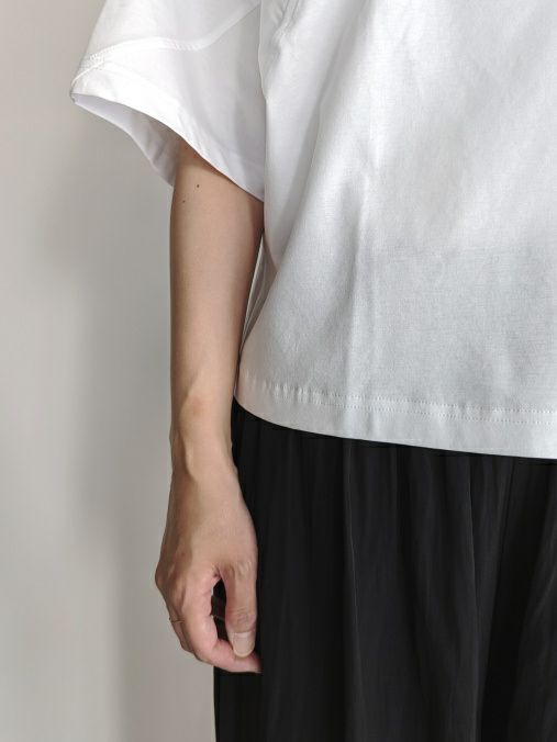 紡績過程で短い繊維を取り除き、繊細な綿糸を使用したTシャツ。糸の段階でマーセライズ加工を施しており、シルクに近い質感を実現しています。
