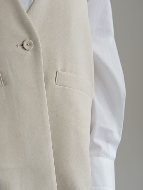 フロントはすっきりとしたワンボタン仕様で、シャツやカットソーとの相性も抜群。インナー次第で印象を変えられるため、幅広いスタイリングを楽しめます。