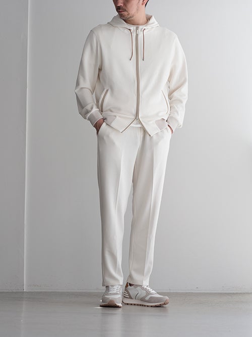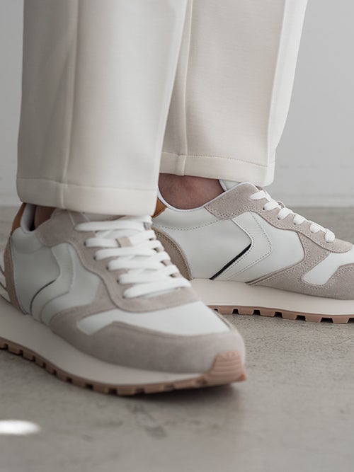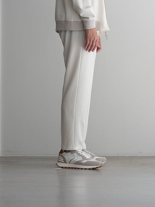生地の雰囲気も鑑みると、スポーティなスニーカーで合わせたくなります。