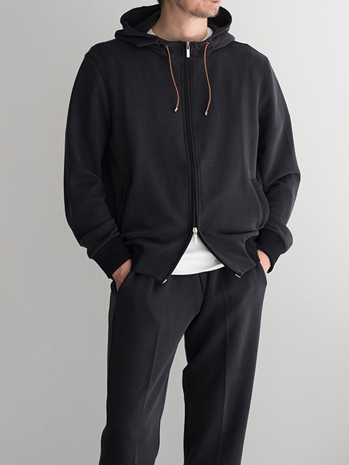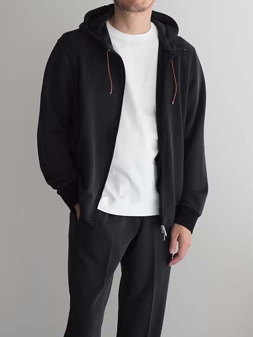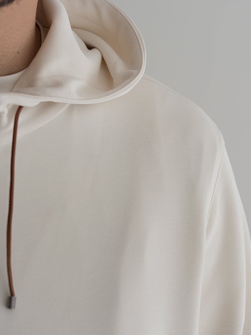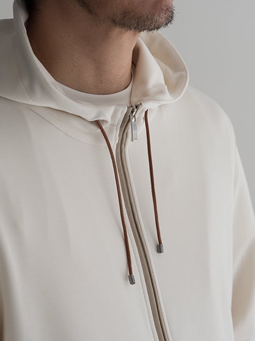 一目で上質とわかる滑らかな生地表面、フードのコードはレザーで上品な見映えです。