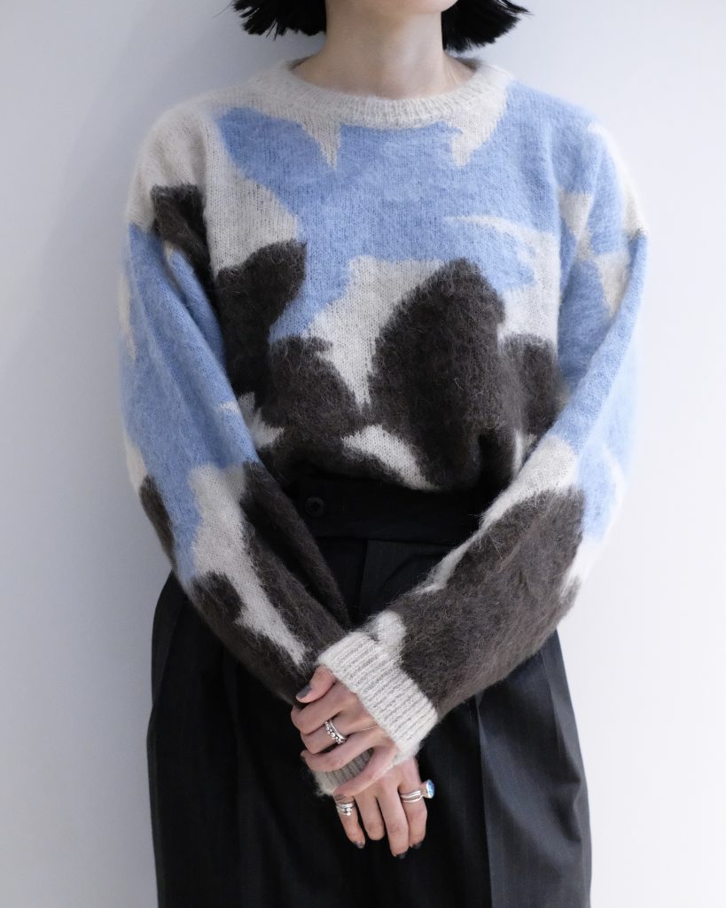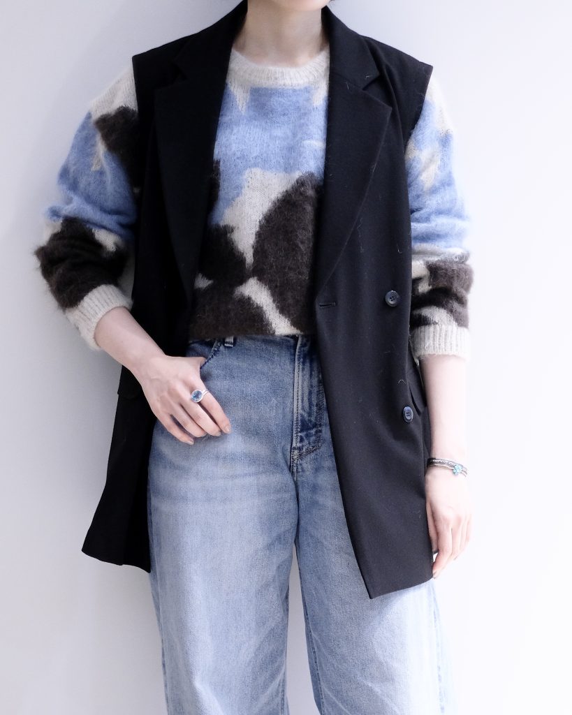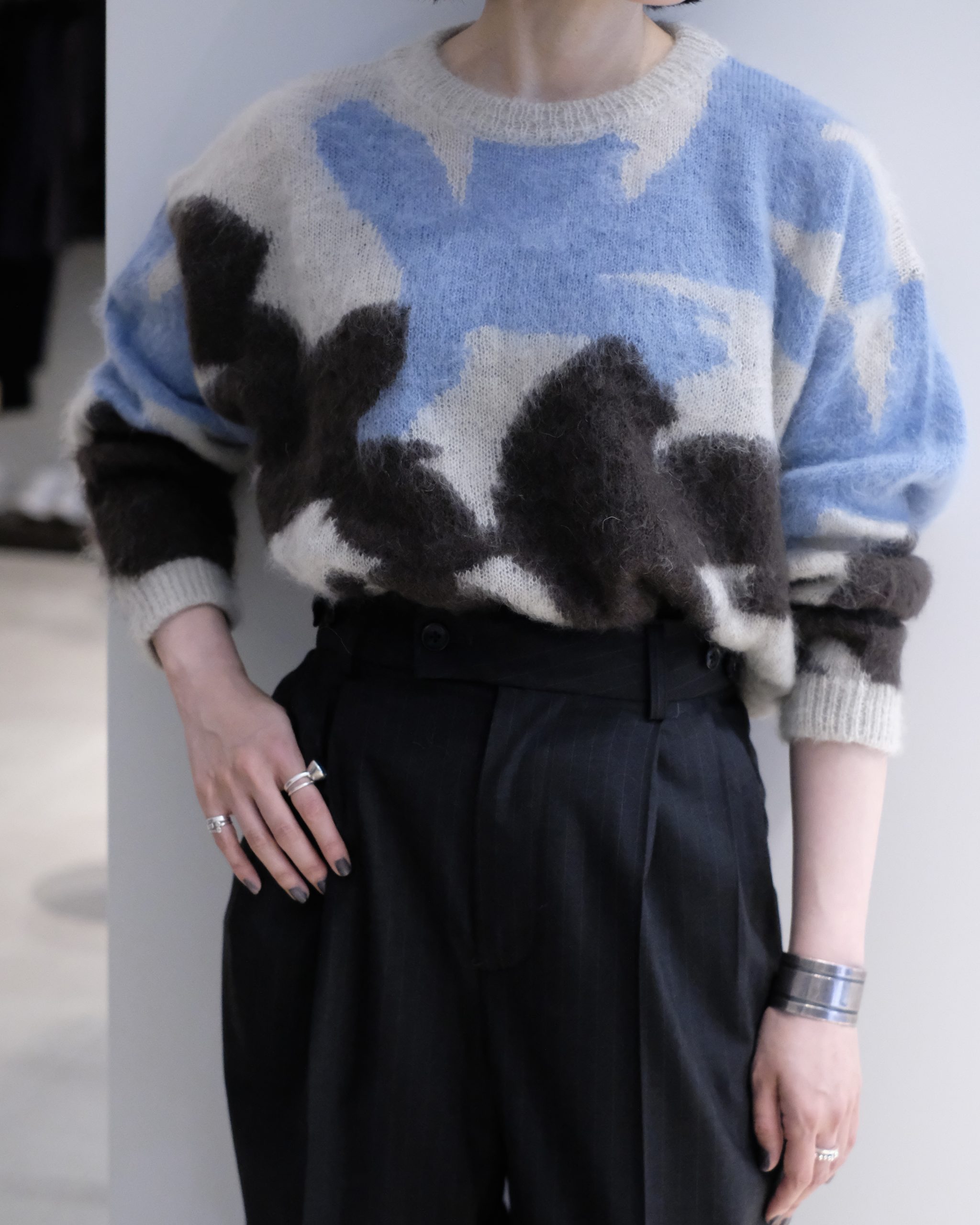 ですが、このニットはモヘア混紡ならではの柔らかい風合いが、大柄の存在感をほどよく中和してくれています。