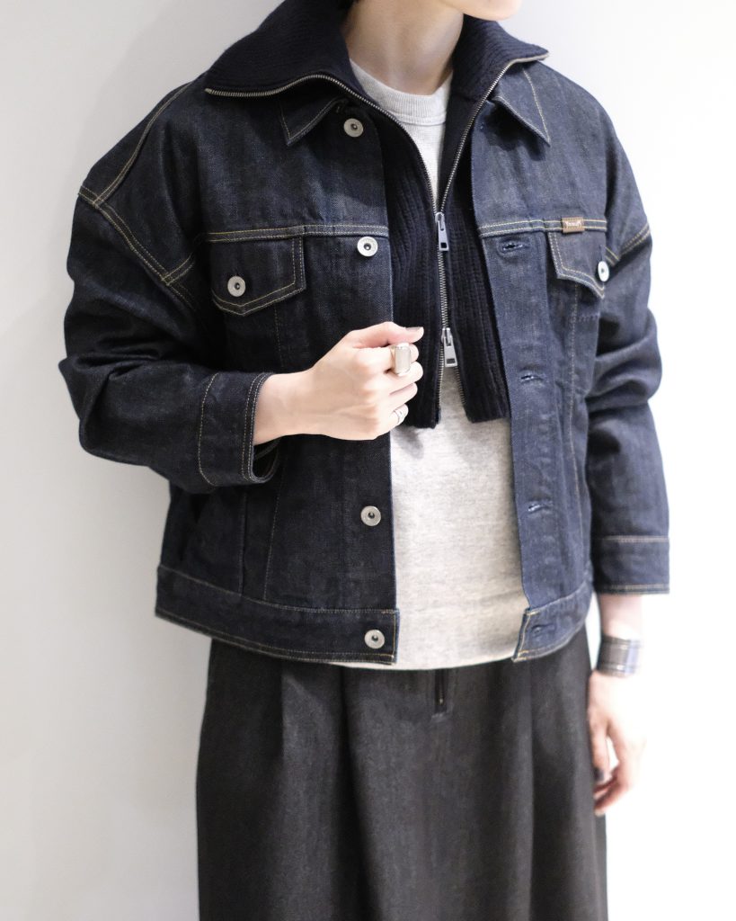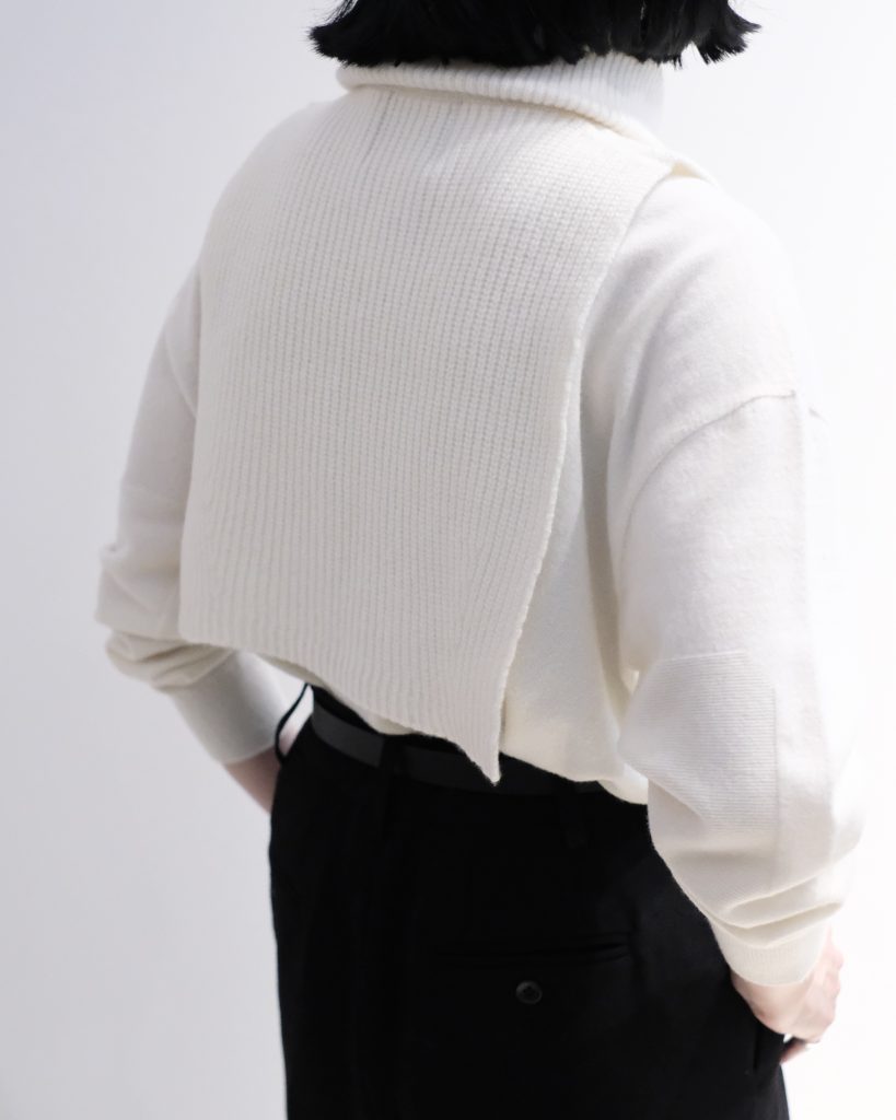 ニットに重ねると、まるでベストを着ているかのようなニュアンスに変化します。