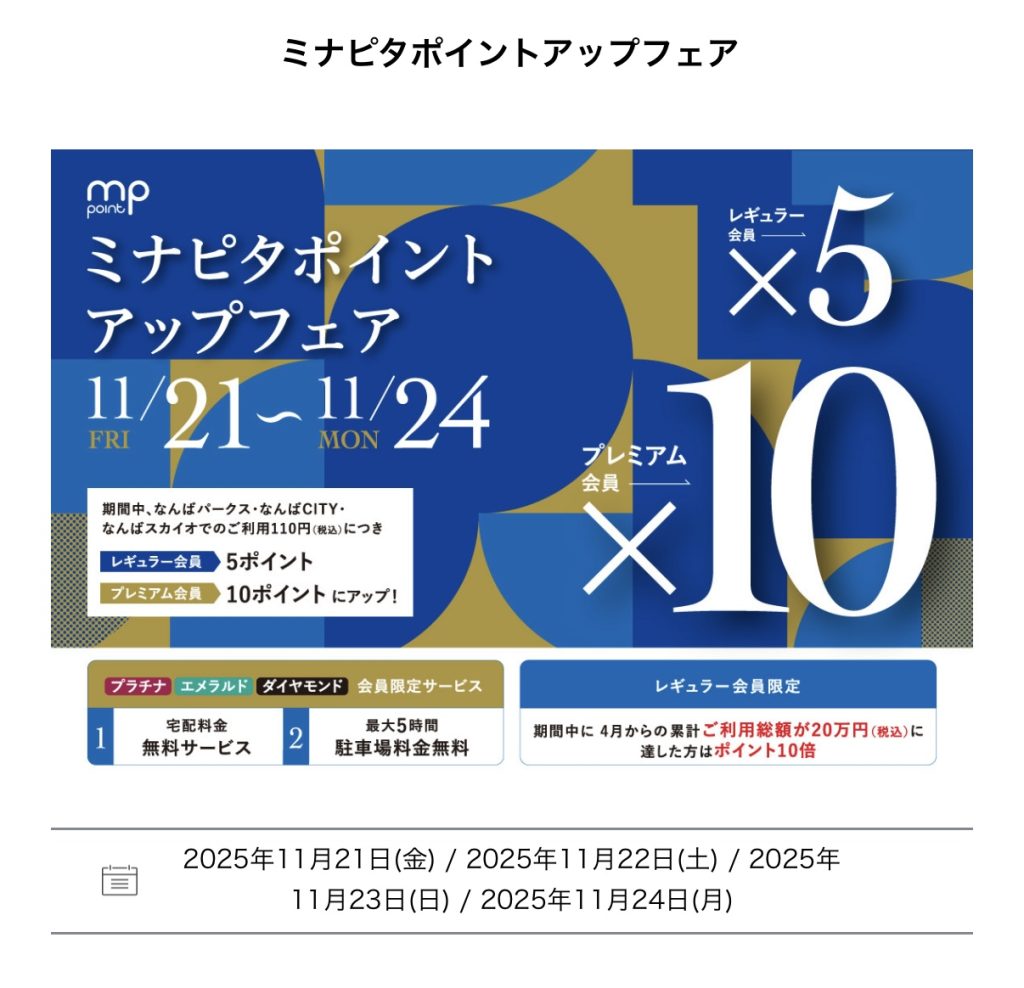 なんばパークスでは、ミナピタポイントアップフェアが開催されます。