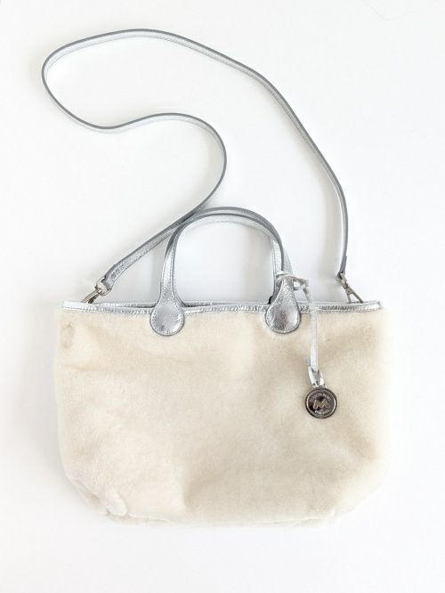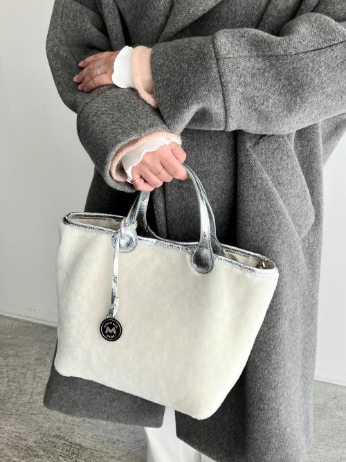 ハンドバッグとしての安定感と、ムートン特有のふんわりとした丸みのあるシルエットが特徴。どこかリッチでありながら、ナチュラルなムードも兼ね備えたデザインが魅力です。
