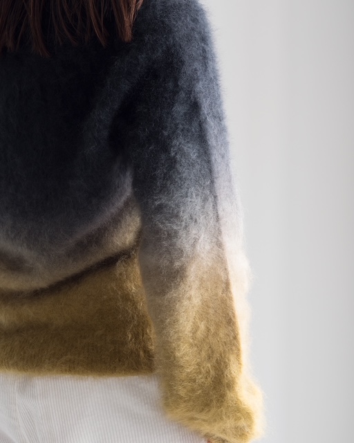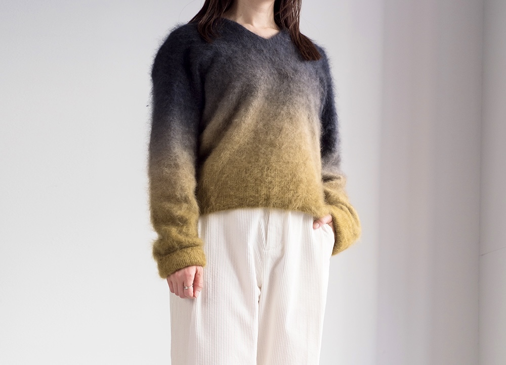 紡績から編み立てまでをすべて国内で行い、山形で編み上げたカシミヤニットに、富山でシャギー加工を施すという拘りの1着。