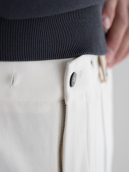 ウエストは両サイドシャーリング仕様で、フロントはドローコード付き。ベルトレスでも自然にフィットしつつ、外から見た印象はあくまでクリーン。