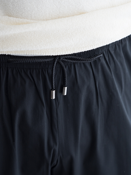 ウエストは総ゴム仕様で、着脱も非常にスムーズ。締め付け感が少なく、それでいてシルエットはすっきりとシャープな印象を損ないません。イージーパンツでありながら、野暮ったさを感じさせないのがこのブランドらしさです。