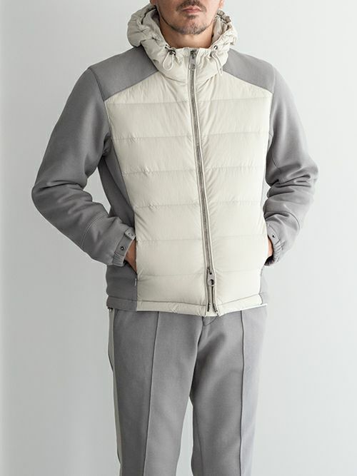 ダウンブルゾンとスウェットパンツという、一見カジュアルな組み合わせでありながら、「素材使い」「シルエット」「ディテール」のすべてがワンランク上の仕上がりです。
