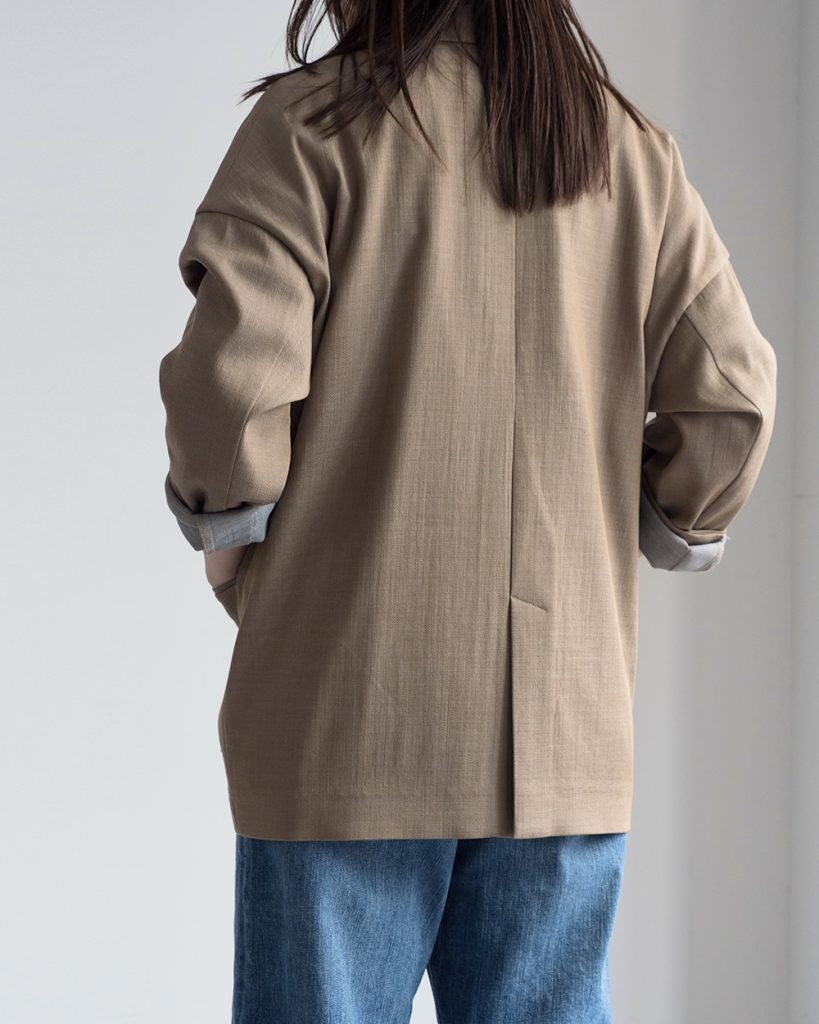 落ち感の美しいセルロース混素材を使用した、上品な印象のダブルジャケット。