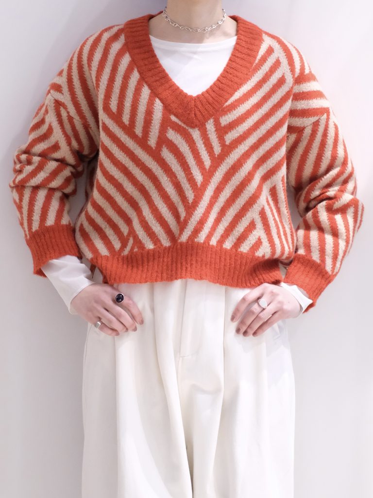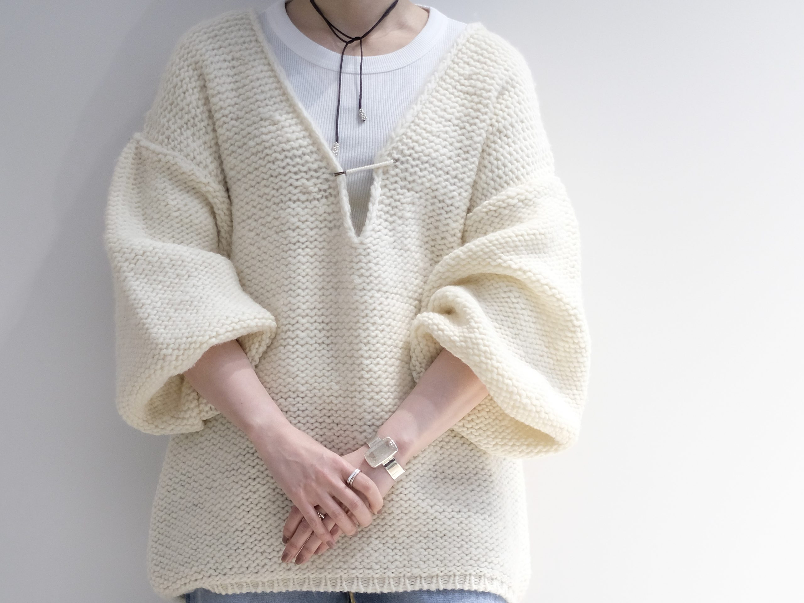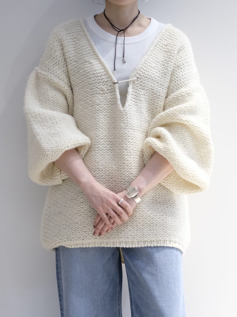 ざっくりとしたボリューム袖とVネックの抜け感が魅力のニット。