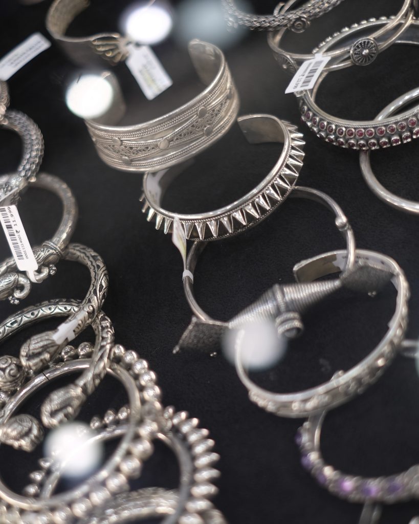 こちらは完成した製品が多く並び、ピアスやバングルなどのアイテムが豊富。
