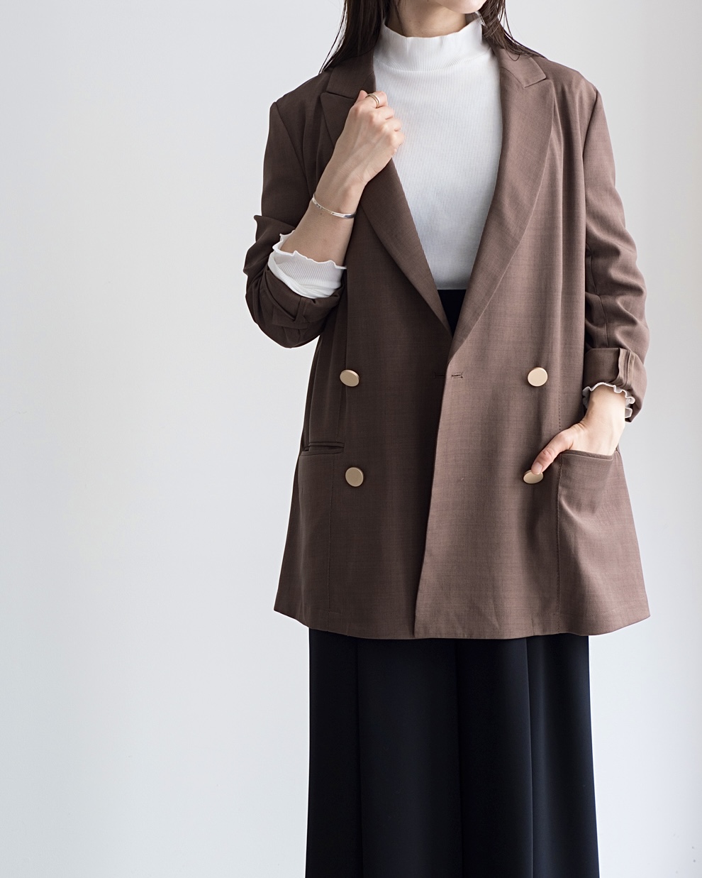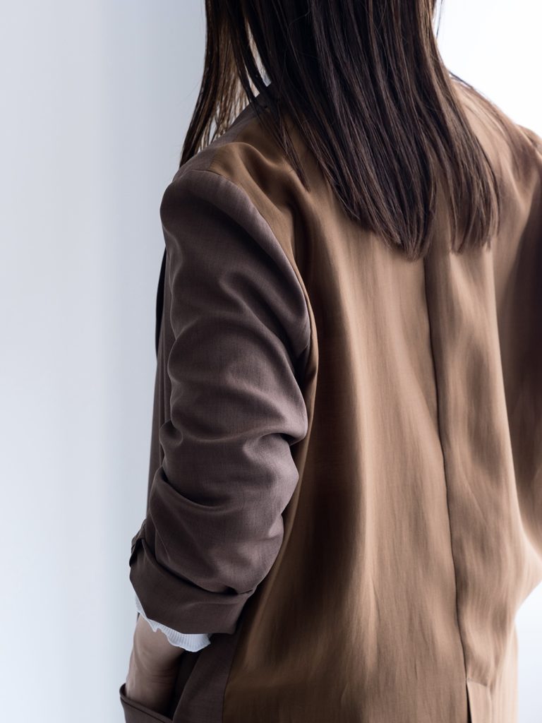 きちんと感のあるダブルジャケットですが、素材に落ち感がある為体に馴染み、堅苦しさがなく柔らかい雰囲気に。