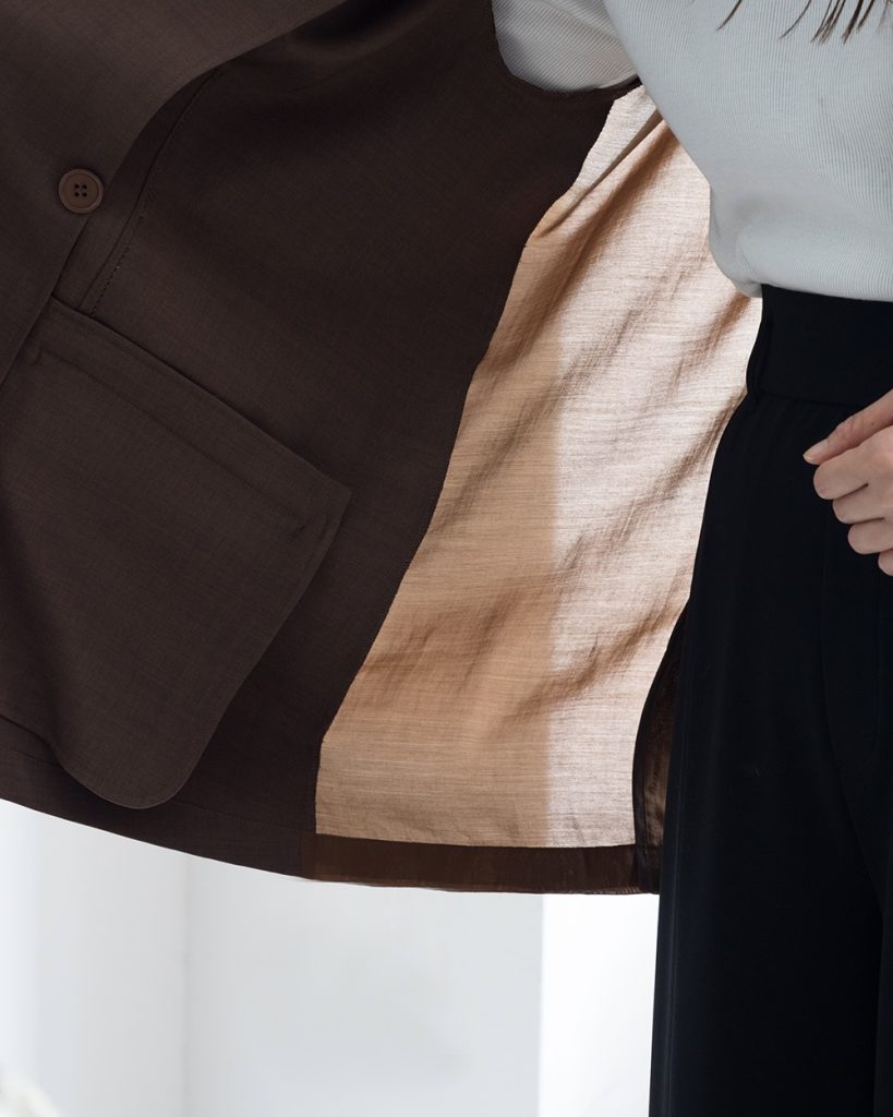 裏地が無いためとても軽く、カーディガンのように気軽に羽織れるのも嬉しいポイントです。