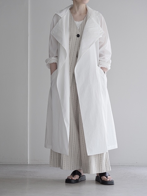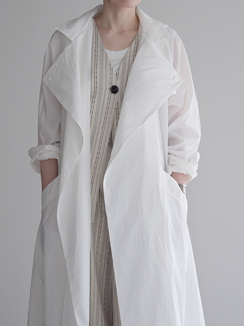 3色展開のこちらのコートは、いずれもリサイクルナイロンをベースに使用し、軽やかさとシワになりにくい実用性、そしてナイロン特有のほのかな艶感が魅力です。