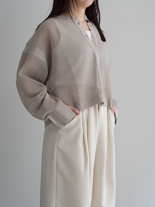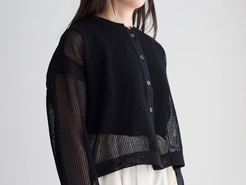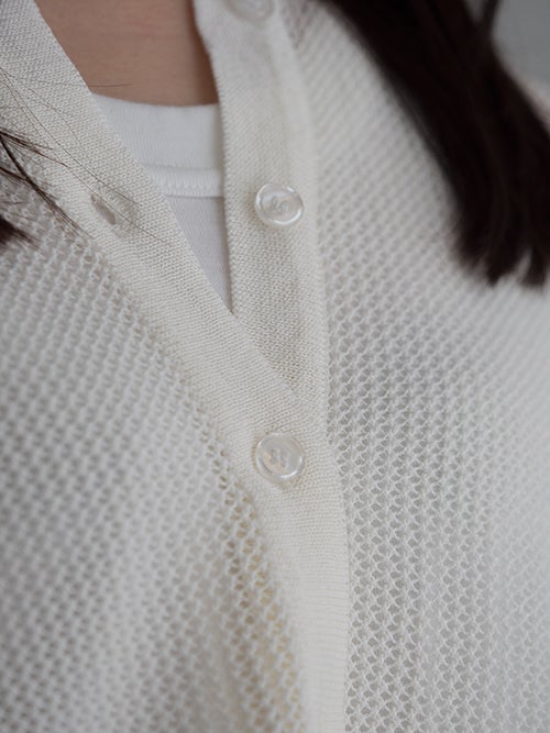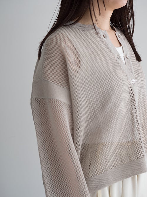 レーヨンとポリエステルの混合糸を使用し、清涼感のあるメッシュ組織で編み上げられたカーディガン。
