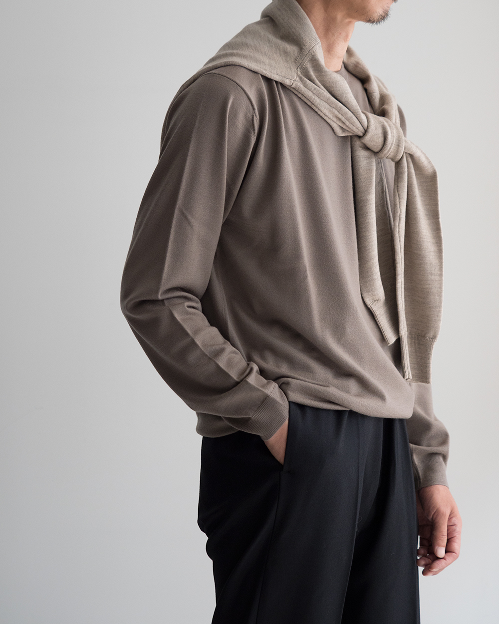 同素材ならではの一体感と、異なる編み地やトーンが生む微妙な陰影が、シンプルながらも深みを生み出します。