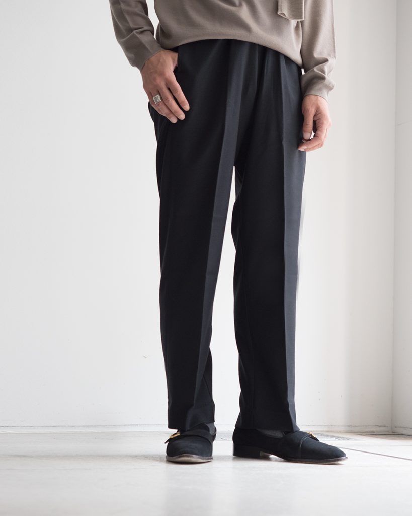黒のトラウザーを合わせることで全体を引き締め、シックで都会的な印象へと導きます。