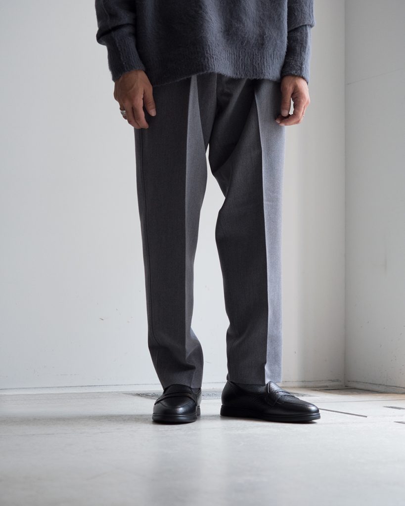 トーンを揃えたグレーのスラックスを合わせることで、洗練された統一感が生まれます。