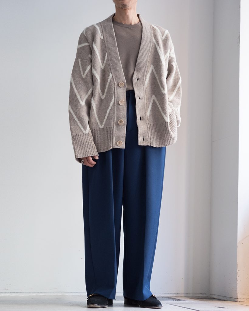 淡いベージュのカーディガンを主役に、ブルーのワイドパンツを合わせた軽やかなスタイル。