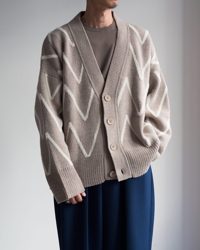 カーディガンの優しい色合いに、パンツの深みのあるブルーがよく映え、シンプルながら目を惹く配色です。