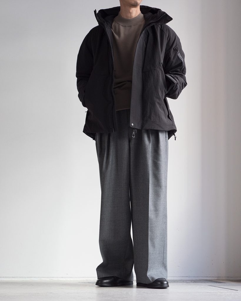 黒×グレーというクラシックな配色ながら、シルエットにゆとりを持たせることで堅さを感じさせない、余裕のある大人のスタイルに。