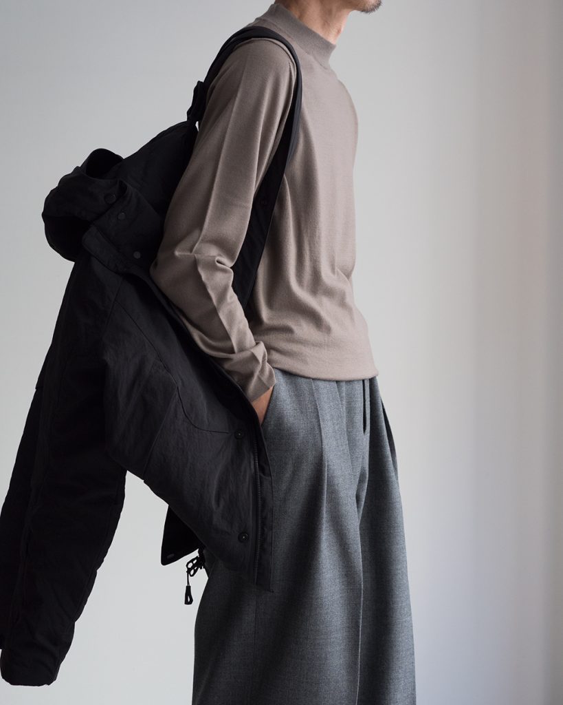 インナーにはLequalのハイゲージモックネックニットをチョイス。絶妙なネックの高さが全体の雰囲気を引き締めてくれます。