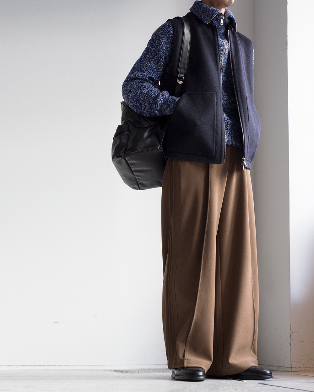 【STYLE 2 艶感のあるウールベストで魅せる、上品なネイビートーン】