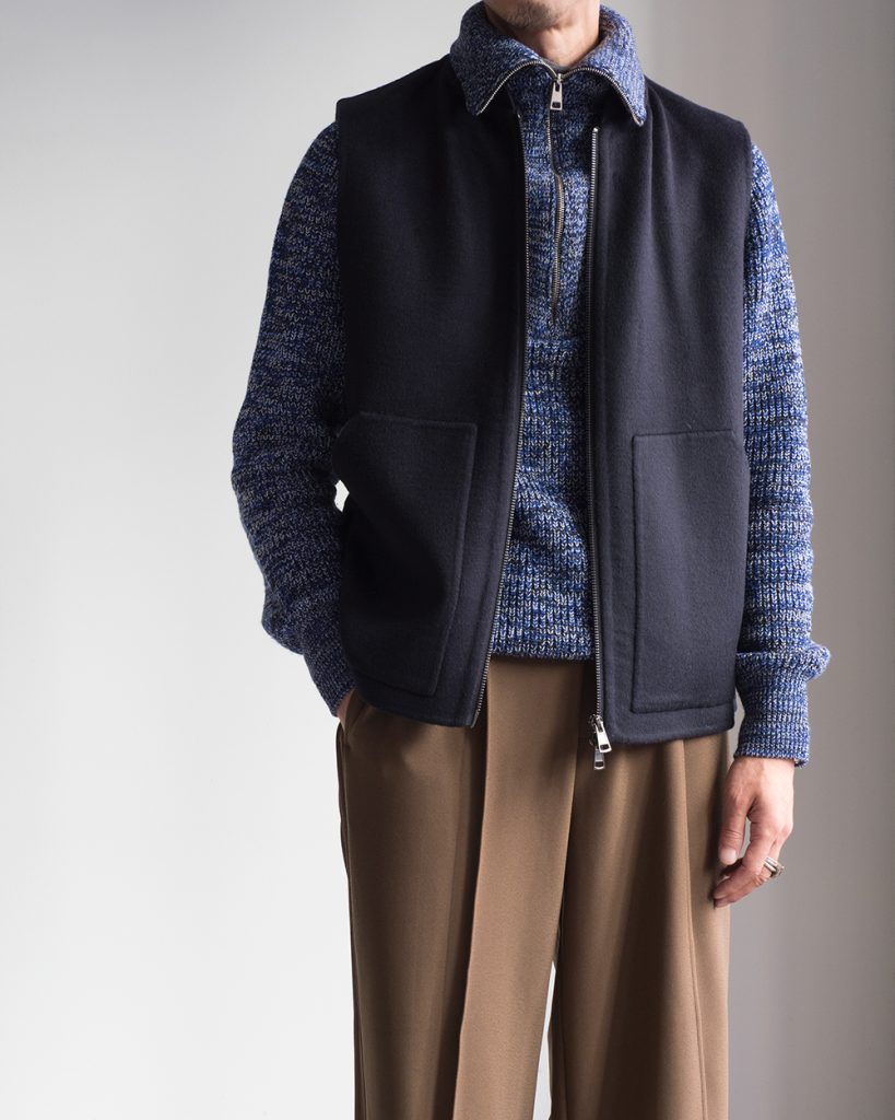 ネイビーカラーのベストは、中綿を入れないウール素材。