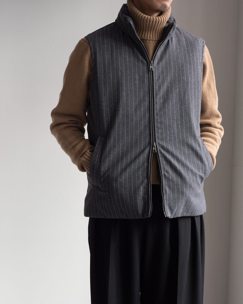 グレーカラーのダウンベストは、表地にウールブレンド素材を使用した一着。