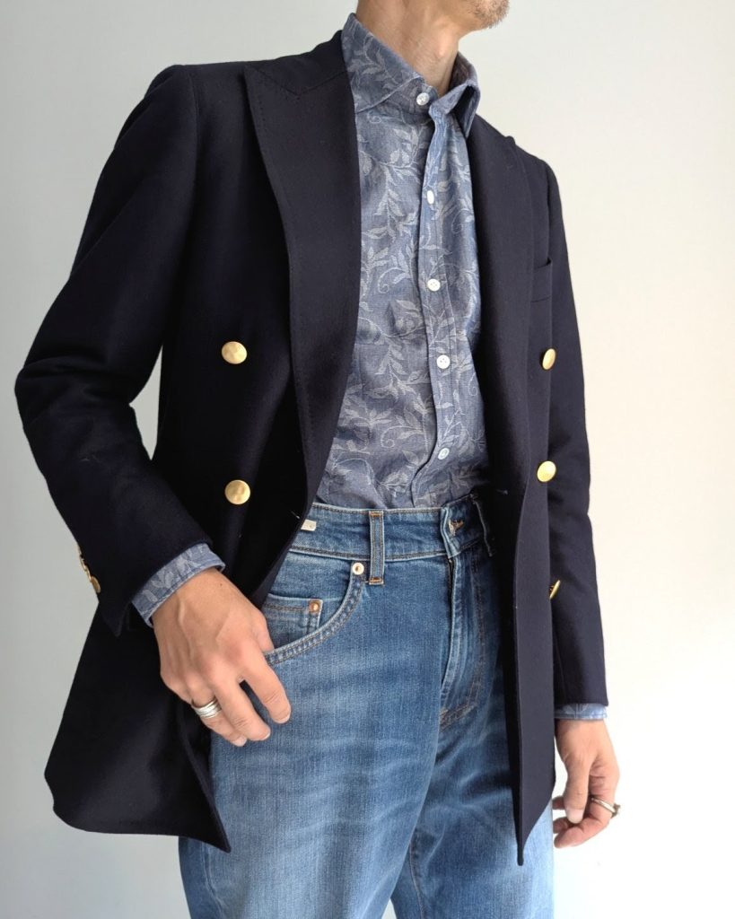 クラシックなダブルブレストのジャケットに、遊び心のある柄物を合わせる事で生まれる知的な余裕。