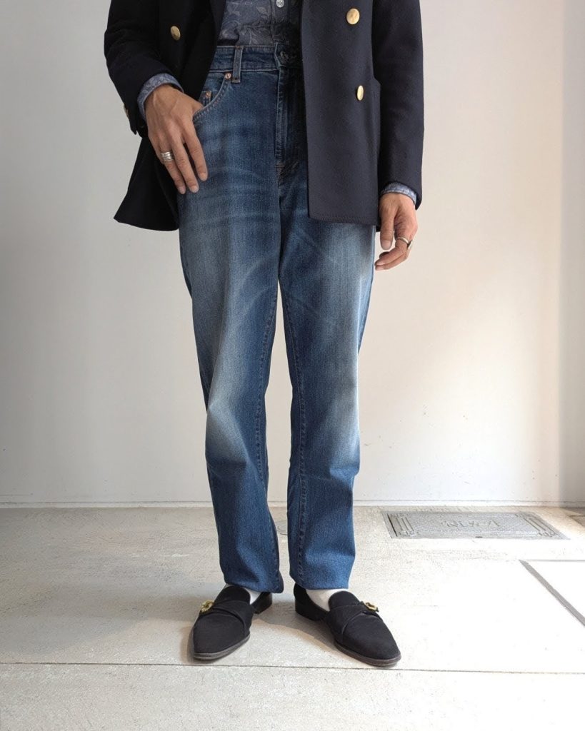 ボトムスにはヴィンテージライクなデニムを。より一層、肩の力の抜けた大人のこなれ感を演出するコーディネートに。
